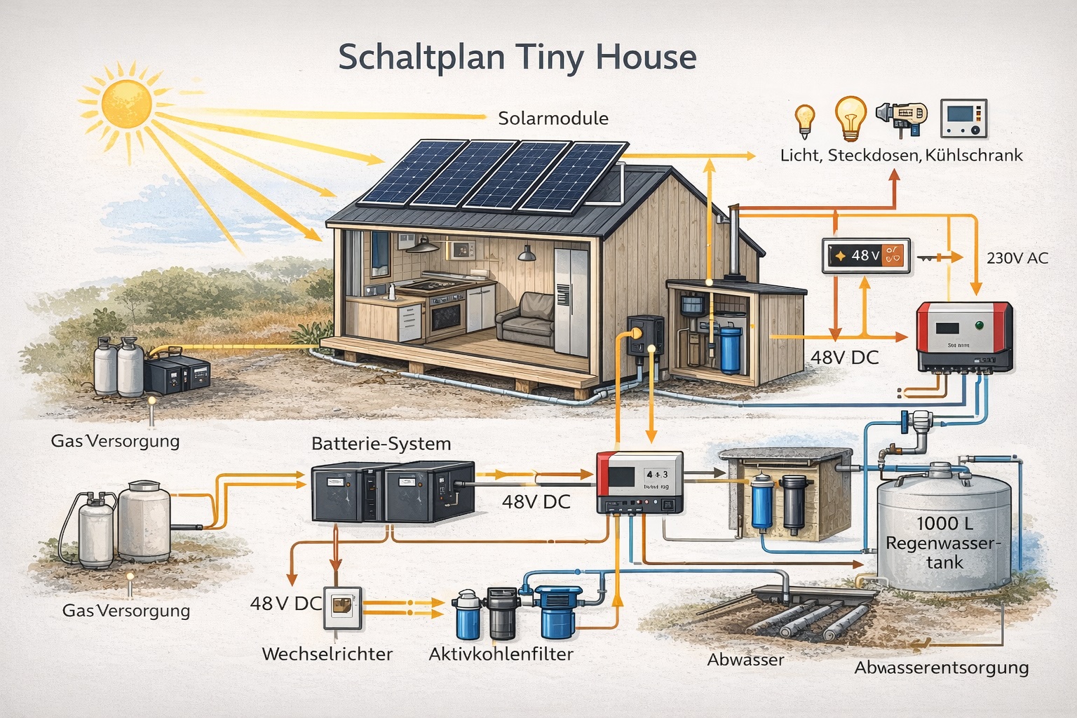 Die Energie der Sonne ist an der Algarve dein wichtigster Verbündeter für ein freies und unabhängiges Leben ☀️ Unsere maßgeschneiderten Lösungen für die Stromversorgung im Coastal Modell machen dich zum Selbstversorger im sonnigen Süden Portugals 🇵🇹 Das System basiert auf einer hocheffizienten Photovoltaik-Anlage, die speziell für die hohe Einstrahlungsintensität zwischen Lagos und Sagres konfiguriert wurde 🔋 Hochwertige Monokristalline Solarmodule wandeln das Licht der über 300 Sonnentage pro Jahr direkt in elektrische Energie um und laden deine leistungsstarken Lithium-Eisenphosphat-Batterien (LiFePO4) auf 🔋 Diese moderne Speichertechnologie ist besonders langlebig und sicher, selbst bei den höheren Temperaturen im portugiesischen Sommer 🌡️ Ein intelligenter Hybrid-Inverter steuert den Energiefluss vollautomatisch und versorgt alle deine Geräte – vom Kühlschrank bis zum Laptop – mit stabilem 230V Wechselstrom 💻 Dank der großzügigen Dimensionierung des Speichers hast du auch nach Sonnenuntergang oder an den seltenen Regentagen genug Reserven für Licht und Komfort 🌙 Alle Komponenten sind für den autarken Betrieb (Off-Grid) optimiert, sodass du komplett auf einen teuren und komplizierten Netzanschluss verzichten kannst 🔌 Über eine benutzerfreundliche App behältst du die Stromproduktion und deinen Verbrauch jederzeit im Blick, egal ob du gerade am Strand oder in deinem Tiny House bist 📱 Erlebe die Sicherheit einer nachhaltigen Energiequelle, die perfekt auf die klimatischen Bedingungen der Algarve abgestimmt ist ✨ Starte jetzt in deine energetische Unabhängigkeit auf tinyhousesalgarve.com 🏠✨